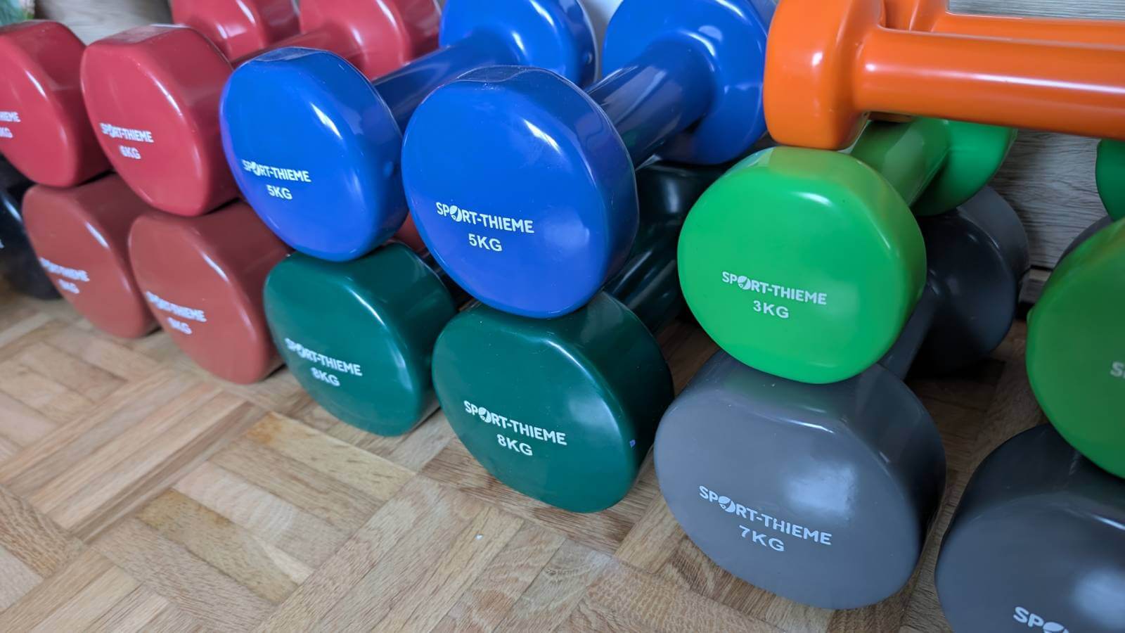 Und hier die etwas schwereren bis hin zu den schwarzen 10 kg Hanteln.
